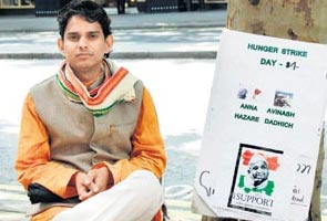 London: Like Anna Hazare, 28-year-old Avinash Dadhich is also from a small village in India. And like Anna, he too is frustrated by corruption in India. "Enough is enough," he said. As Anna continues his 15-day hunger strike at Ramlila Maidan, supporting him nearly 5,000 miles away, Avinash sits on his hunger strike outside the Indian High Commission at Aldwych in central London.