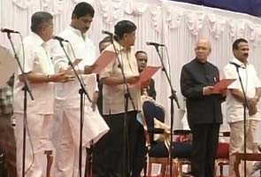Among the first to take oath was Jagadish Shettar, the man who became the rallying point of a rebellion within the BJP against Mr Yeddyurappa and his close aide Sadananda Gowda, who is now Chief Minister. Mr Shettar was the man 55 of the BJP's 121 MLAs wanted as Chief Minister. About 10 more - 65 - voted for Mr Gowda last week in a secret ballot vote.