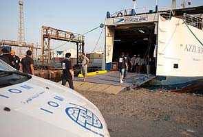 A large ferry chartered by the International Organization for Migration docked in Tripoli's harbor on Saturday, unloading food, water and medical supplies. On Sunday, the vessel is to take aboard 1,200 stranded foreigners, an IOM official said.