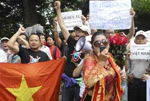 About 50 protesters showed up at Hanoi's landmark Hoan Kiem Lake, unfurling banners and shouting anti-China slogans. Main streets in the capital's tourist district were quickly blocked off by police and the protesters were dragged onto public buses by security officers. Many clung to the windows and doors, still shouting from inside while holding up their signs.