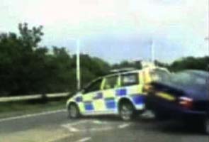 CCTV footage released by Surrey police on Tuesday shows officers trying to set up a roadblock on the slip road when the stolen BMW collides with their stationary vehicle.