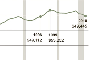 The past decade was also marked by a growing gap between the very top and very bottom of the income ladder. Median household income for the bottom tenth of the income spectrum fell by 12 percent from a peak in 1999, while the top 90th percentile dropped by just 1.5 percent. Overall, median household income adjusted for inflation declined by 2.3 percent in 2010 from the previous year, to $49,445. That was 7 percent less than the peak of $53,252 in 1999. Part of the income decline over time is because of the smaller size of the American family.
